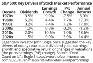 Looking ahead, several factors suggest that this growth can continue. Companies are benefiting from technological innovation, productivity gains and resilient consumer demand, all of which support sustained earnings growth. Of course, history reminds us that earnings growth alone doesn’t guarantee high market returns. In the 1970s, despite solid earnings growth of 9.9 percent, high inflation and the global energy shocks kept equity markets subdued. Indeed, growth in markets, economies—and even human progress—is rarely linear.