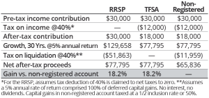 Myth 2: RRSPs aren’t worth it because withdrawals are fully taxed, whereas in non-registered accounts, only income and gains are taxed. A common complaint is that RRSP withdrawals are fully taxed at marginal rates, whereas non-registered accounts only tax income and gains (with favourable tax treatment for dividends and capital gains). While it’s true that RRSP withdrawals (usually from a Registered Retirement Income Fund (RRIF)) are taxed as income, what’s often forgotten is the initial tax deduction at contribution. Remember: a $30,000 RRSP contribution is equivalent to an after-tax contribution of $18,000 at a marginal tax rate of 40 percent. If your tax rate is the same at the time of contribution and withdrawal, you effectively receive a tax-free rate of return on your net after-tax RRSP contribution (chart). In many cases, even if your tax rate is higher at the time of withdrawal, you may be better off compared to a non-registered account due to the effect of tax-free compounding over long time periods.