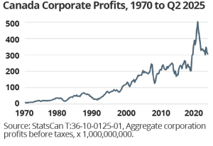 The earnings story, so far, has been strong. U.S. corporate margins have expanded, with the average S&P 500 net income margin climbing above 10 percent this decade, roughly double the level of the 1990s. Canadian corporate profits have followed a similar trajectory, though fluctuations in commodity prices, including a pronounced peak in 2022, have added more volatility to overall profits (graph above).