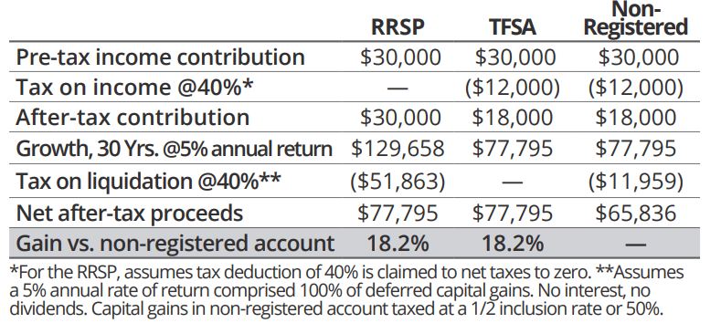 Myth 2: RRSPs aren’t worth it because withdrawals are fully taxed, whereas in non-registered accounts, only income and gains are taxed. A common complaint is that RRSP withdrawals are fully taxed at marginal rates, whereas non-registered accounts only tax income and gains (with favourable tax treatment for dividends and capital gains). While it’s true that RRSP withdrawals (usually from a Registered Retirement Income Fund (RRIF)) are taxed as income, what’s often forgotten is the initial tax deduction at contribution. Remember: a $30,000 RRSP contribution is equivalent to an after-tax contribution of $18,000 at a marginal tax rate of 40 percent. If your tax rate is the same at the time of contribution and withdrawal, you effectively receive a tax-free rate of return on your net after-tax RRSP contribution (chart). In many cases, even if your tax rate is higher at the time of withdrawal, you may be better off compared to a non-registered account due to the effect of tax-free compounding over long time periods.
