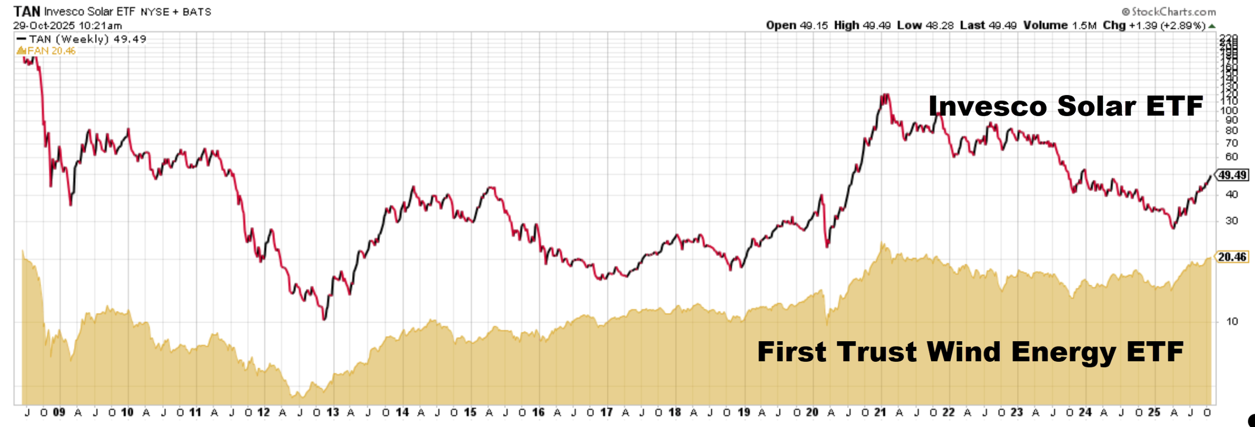 Bill Gates is taking some flak for his pivot, and I recognize that his change may not be welcome news to some readers. The beauty of the energy market is that we can find investments that align with your preferences. Wind power and solar are currently beginning to show signs of life after a long term bear-market: