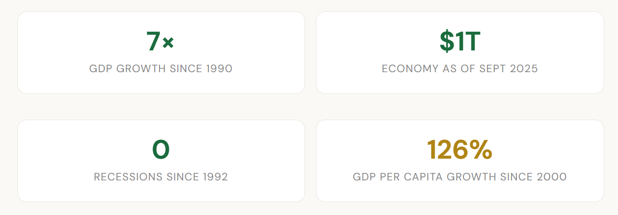 Poland kept walking. Every government—left, right, post-communist, post-Solidarity—maintained market reforms. EU accession in 2004 was rocket fuel. Poland now outperforms every European G20 economy on growth. It finished 2025 at 3.6%, accelerating to 4% in Q4.