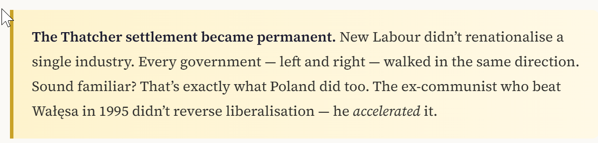 That humiliation produced Margaret Thatcher. She did to Britain what Balcerowicz would later do to Poland: privatized state industries, broke the unions’ stranglehold, deregulated markets, cut subsidies, restructured taxes. GDP per capita nearly tripled during her tenure. Even PM Tony Blair Labour’s most successful post-war PM later called her reforms a matter of “basic fact.”