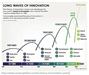 Economist Joseph Schumpeter developed the theory of innovation cycles suggesting that business cycles operate under long waves of innovation (see infographic). These new waves emerge as the markets are disrupted by “creative destruction.” One observation is that as time progresses, these waves are getting shorter — some suggest that this is because there are diminishing marginal returns for innovation.