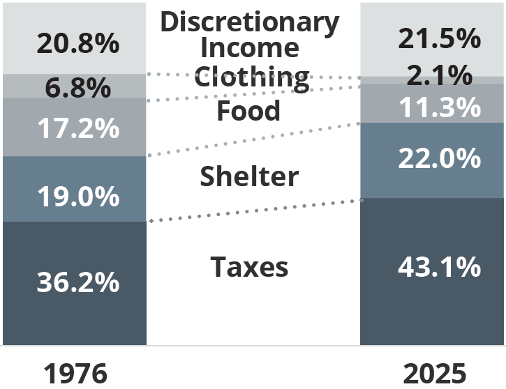 Despite rising living costs, the share of income spent on necessities has declined. In 1976, households spent about 43 percent of their income on shelter, food and clothing. Today, this is around 35 percent. What has risen is the share we pay to taxes. In 2025, the average Canadian family paid 43.1 percent in taxes.1 Put differently, if taxes were paid upfront, the first 158 days’ earnings would go entirely to the government!