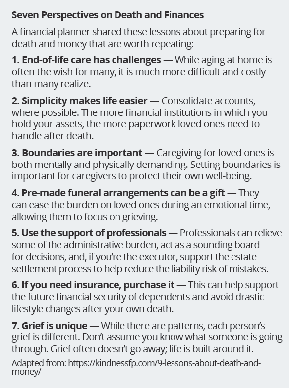 In the immediate aftermath, it’s important to seek help from others where needed: family members, trusted friends and professionals who can provide support. As you move forward, here are six considerations to help you manage your own financial well-being through this transition: