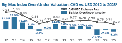 Will the loonie continue its fall? The “Big Mac Index” may offer some fun “food for thought.” Published by The Economist, it was developed as a lighthearted way to make exchange-rate theory digestible by comparing the purchasing power parity (PPP) of currencies. PPP suggests that, over time, exchange rates should adjust so that an identical basket of goods and services costs the same in each country. The index estimates an exchange rate by comparing the price of a Big Mac in different nations to its cost in the U.S. By comparing this to the prevailing exchange rate, it gauges whether a currency is under- or overvalued. According to the index, the CAD is undervalued.