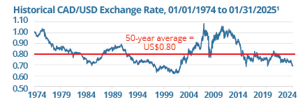 The CAD is trading below its historical average. To start 2025, it fell below 68 U.S. cents – a level not seen in two decades. The decline has been driven by factors such as diverging U.S. and Canadian monetary policies (lower interest rates make the CAD less attractive to foreign investors), ongoing tariff threats and a strong U.S. dollar. Historically, the CAD has moved in cycles. From 2005 to 2014, it benefitted from strong resource demand, surpassing parity with the U.S. dollar (USD) in 2007 and peaking at US$1.09. Over 50 years, it has averaged around US$0.80.1