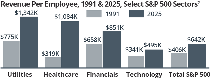 Few doubt that AI will be an economic driver in the years ahead. Technology has long supported productivity gains. Consider how revenue per employee has dramatically increased since 1991 (chart, top), fuelled by computers, the internet, mobile devices, software and the innovation they’ve enabled. However, key questions remain: Will AI live up to its transformative promise, reshaping the world like the steam engine or lightbulb? And, beyond the excitement, who will emerge as the winners?