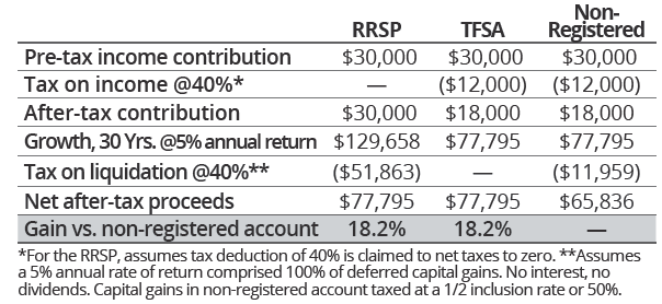 Myth 2: RRSPs aren’t worth it because withdrawals are fully taxed, whereas in non-registered accounts, only income and gains are taxed. A common complaint is that RRSP withdrawals are fully taxed at marginal rates, whereas non-registered accounts only tax income and gains (with favourable tax treatment for dividends and capital gains). While it’s true that RRSP withdrawals (usually from a Registered Retirement Income Fund (RRIF)) are taxed as income, what’s often forgotten is the initial tax deduction at contribution. Remember: a $30,000 RRSP contribution is equivalent to an after-tax contribution of $18,000 at a marginal tax rate of 40 percent. If your tax rate is the same at the time of contribution and withdrawal, you effectively receive a tax-free rate of return on your net after-tax RRSP contribution (chart). In many cases, even if your tax rate is higher at the time of withdrawal, you may be better off compared to a non-registered account due to the effect of tax-free compounding over long time periods.