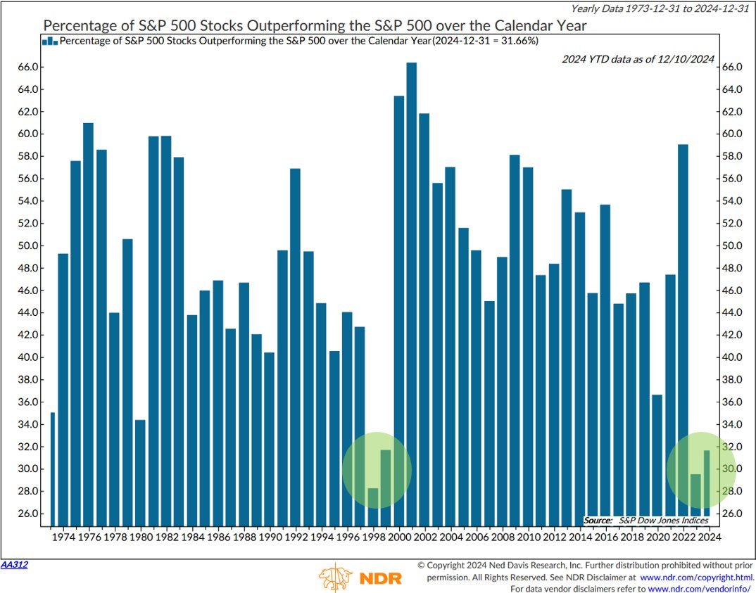 Fewer than 32 per cent of S&P 500 companies have outperformed the S&P this year, one of the lowest readings over the last 50 years. In fact, the performance from 2023-24 is almost identical to that of 1998-1999. See Here