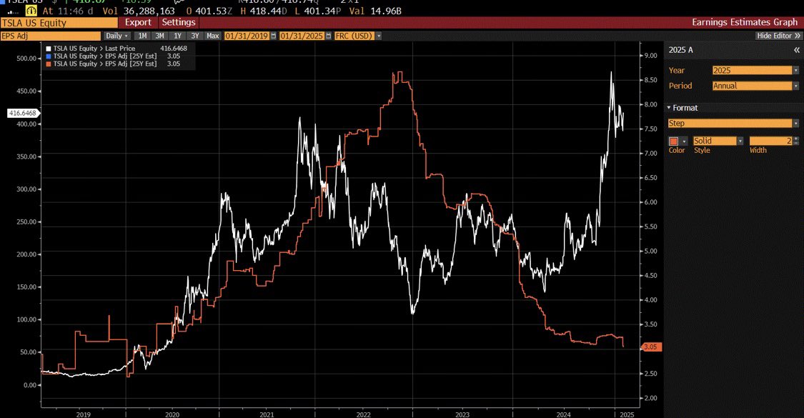 I know “fundamentals don’t matter” anymore with $TSLA, but still find it remarkable that the consensus 2025 estimate for adjusted earnings-per-share (EPS) ($3.05) has completely round-tripped to where it was in 2019, before the stock went parabolic. See Here
