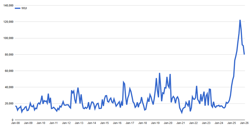 But headline numbers only tell part of the story. Despite these robust results, the global uncertainty backdrop remains extreme. The Global Economic Policy Uncertainty Index—built from newspaper-based measures across major economies—recently surged to levels near the highs seen during the most stressed periods in the series, and remains materially elevated versus long‑run norms.  This matters because markets tend to tolerate ambiguity—right up until they don’t. When uncertainty reaches these extremes, backward‑looking beats and misses matter far less than the forward path and share prices can reprice abruptly.