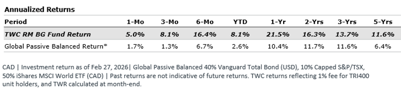 Against that backdrop, we have positioned client portfolios with large asset allocation changes that have yielded one of the best 12‑months and starts to a new year that we’ve ever had. Our TWC Risk‑Managed Balanced Growth fund gained approximately 5 per cent in February, bringing our year‑to‑date return to 8.1 per cent and boosting our 12‑month return to 21.5 per cent—both of which are well ahead of our global passive balanced benchmark portfolio that posted only 2.6 per cent over the past two months and 10.4 per cent over the past 12 months to the end of February.
