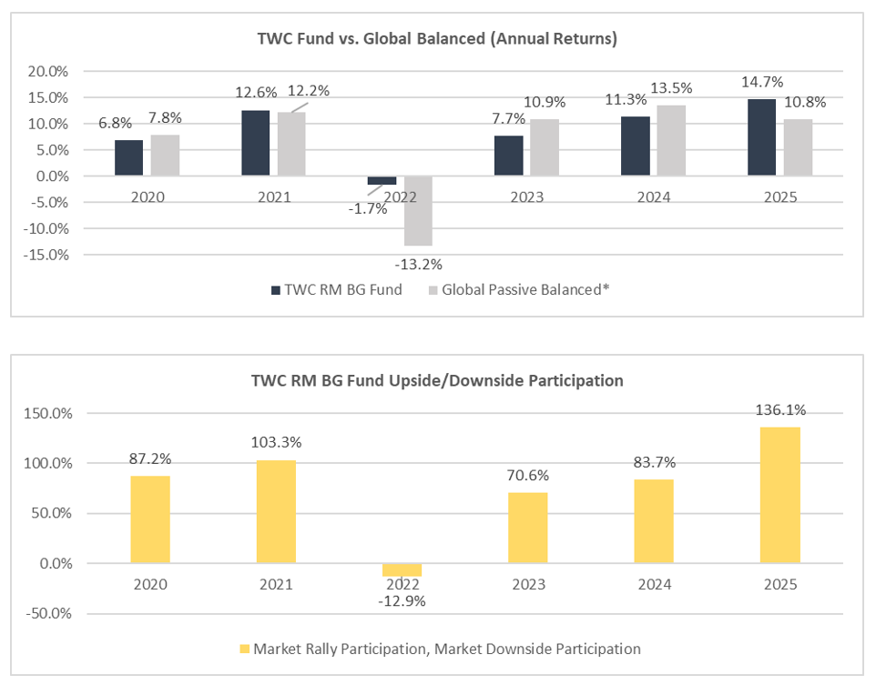 The majority of our clients own units of our TWC Risk-Managed Balanced Growth Fund, and/or have similar strategies directly within their accounts. Our fund had a solid year in the markets returning 14.7 per cent in 2025, outperforming the 10.8 per cent passive benchmark. There are years where we will underperform like 2023 and 2024 but we aim to still participate in those strong market years. There are also periods like 2025 and 2021 where we will outperform with superior returns. However, we really shine in years like 2022 where markets correct via our embedded downside protection.