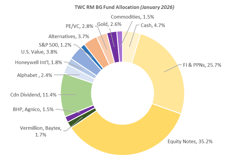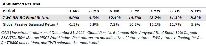 Our TWC Risk‑Managed Balanced Growth strategy continued to deliver on its mandate in 2025, with the fund returning 14.7 per cent and outperforming the 10.8 per cent passive benchmark, reinforcing its long‑term pattern of participating in strong markets while shining during corrections such as 2022 thanks to embedded downside protection. Entering 2026, we repositioned selectively: a long‑dated U.S. Treasury PAR note matured inside its barrier — effectively acting as recession insurance — allowing us to redeploy into twin‑win structured notes capable of earning returns in both rising and falling markets through asymmetric payoffs. We also realized a substantial gain on silver, rotating into gold and BHP Group to capitalize on an emerging global copper deficit expected to widen dramatically by 2040. Additionally, we exited Berkshire and moved into Honeywell, where a sum‑of‑the‑parts (SOTP) breakup is projected to unlock significant value. Looking ahead, we maintain a prudent 60 per cent overweight to structured notes — emphasizing lower‑risk indices and principal‑protected strategies — paired with convex twin‑win notes, positioning the portfolio defensively yet opportunistically for an uncertain year.