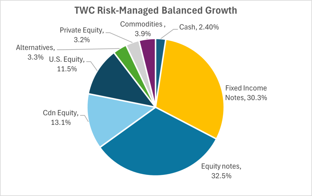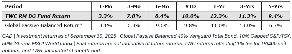 Our disciplined approach has delivered results. The TWC Risk-Managed Balanced Growth Fund is up 10 per cent year-to-date, slightly ahead of our global passive balanced index at 9.8 per cent. Over five years, we’ve achieved an annualized 9.4 per cent — well above our six to eight per cent goals-based target — compared to 6.7 per cent for the passive benchmark.