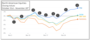 The final, and Thanksgiving shortened, week of the month salvaged what had been a dismal period for North American equity indexes. The S&P 500 and Dow eked out small gains but gains nonetheless after rising more than 3 percent last week. The TSX rose 4 percent in the last week and achieved another all-time high. In the four trading days last week, NASDAQ jumped nearly 5 percent but remained 1½ percent below its level from the end of October.